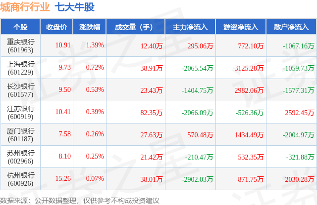个股表现方面,城商行行业当日领涨股为重庆银行(601963),该股当日报收10.91,上涨1.39%,成交量12.4万,主力资金净流入295.06万元。上海银行(601229)以上涨0.72%紧随其后,该股当日成交量38.91万,主力资金净流出2065.54万元。除此之外,长沙银行(601577)、江苏银行(600919)、厦门银行(601187)均进入当日牛股之列。具体个股列表见下表: