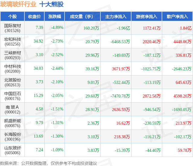 个股表现方面,玻璃玻纤行业当日领跌股为国际复材(301526),该股当日报收7.39,下跌4.89%,成交量160.2万,主力资金净流出1.96亿元。宏和科技(603256)以下跌2.73%紧随其后,该股当日成交量20.79万,主力资金净流出6468.53万元。除此之外,三峡新材(600293)、中材科技(002080)、北玻股份(002613)均进入当日熊股之列。具体个股列表见下表: