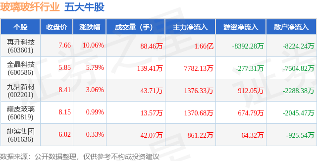 个股表现方面,玻璃玻纤行业当日领涨股为再升科技(603601),该股当日报收7.66,上涨10.06%,成交量88.46万,主力资金净流入1.66亿元。金晶科技(600586)以上涨5.79%紧随其后,该股当日成交量139.41万,主力资金净流入7782.13万元。除此之外,九鼎新材(002201)、耀皮玻璃(600819)、旗滨集团(601636)均进入当日牛股之列。具体个股列表见下表: