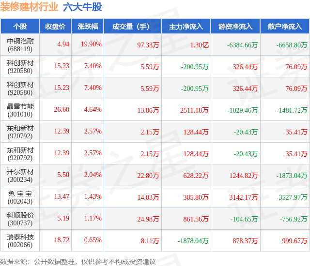 个股表现方面,装修建材行业当日领涨股为中钢洛耐(688119),该股当日报收4.94,上涨19.9%,成交量97.33万,主力资金净流入1.3亿元。科创新材(920580)以上涨7.4%紧随其后,该股当日成交量5.59万,主力资金净流出200.95万元。除此之外,科创新材(920580)、晶雪节能(301010)、东和新材(920792)均进入当日牛股之列。具体个股列表见下表: