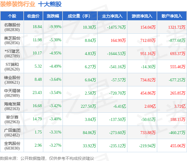 个股表现方面,装修装饰行业当日领跌股为名雕股份(002830),该股当日报收18.84,下跌9.99%,成交量10.38万,主力资金净流出1475.76万元。美芝股份(002856)以下跌5.3%紧随其后,该股当日成交量8.04万,主力资金净流入164.99万元。除此之外,*ST建艺(002789)、ST瑞和(002620)、维业股份(300621)均进入当日熊股之列。具体个股列表见下表: