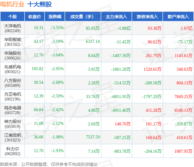 个股表现方面,电机行业当日领跌股为大洋电机(002249),该股当日报收10.31,下跌3.55%,成交量85.05万,主力资金净流出1.88亿元。华阳智能(301502)以下跌3.1%紧随其后,该股当日成交量6337.0,主力资金净流出11.45万元。除此之外,华瑞股份(300626)、兆威机电(003021)、八方股份(603489)均进入当日熊股之列。具体个股列表见下表: