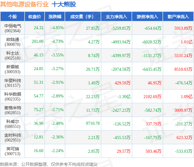 个股表现方面,其他电源设备行业当日领跌股为中恒电气(002364),该股当日报收24.32,下跌4.85%,成交量27.85万,主力资金净流出5259.85万元。欧陆通(300870)以下跌4.73%紧随其后,该股当日成交量4.27万,主力资金净流出4093.94万元。除此之外,科士达(002518)、新雷能(300593)、华塑科技(301157)均进入当日熊股之列。具体个股列表见下表:
