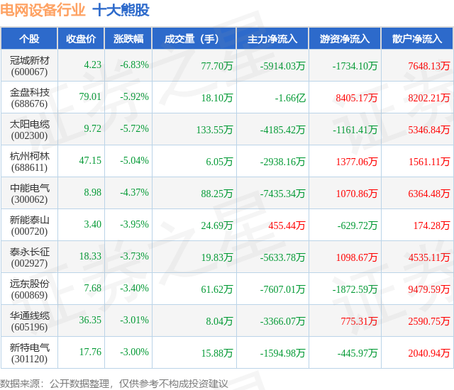 个股表现方面,电网设备行业当日领跌股为冠城新材(600067),该股当日报收4.23,下跌6.83%,成交量77.7万,主力资金净流出5914.03万元。金盘科技(688676)以下跌5.92%紧随其后,该股当日成交量18.1万,主力资金净流出1.66亿元。除此之外,太阳电缆(002300)、杭州柯林(688611)、中能电气(300062)均进入当日熊股之列。具体个股列表见下表: