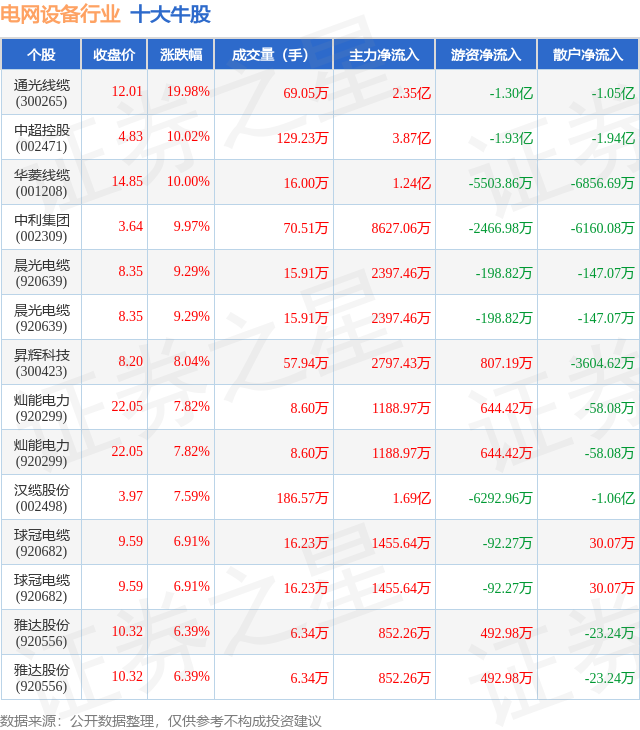 个股表现方面,电网设备行业当日领涨股为通光线缆(300265),该股当日报收12.01,上涨19.98%,成交量69.05万,主力资金净流入2.35亿元。中超控股(002471)以上涨10.02%紧随其后,该股当日成交量129.23万,主力资金净流入3.87亿元。除此之外,华菱线缆(001208)、中利集团(002309)、晨光电缆(920639)均进入当日牛股之列。具体个股列表见下表: