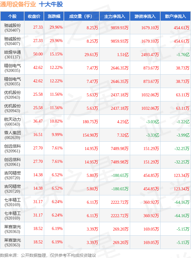 个股表现方面,通用设备行业当日领涨股为驰诚股份(920407),该股当日报收27.33,上涨29.96%,成交量8.25万,主力资金净流入9859.93万元。驰诚股份(920407)以上涨29.96%紧随其后,该股当日成交量8.25万,主力资金净流入9859.93万元。除此之外,哈焊华通(301137)、精创电气(920035)、精创电气(920035)均进入当日牛股之列。具体个股列表见下表: