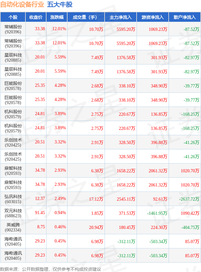 个股表现方面,自动化设备行业当日领涨股为常辅股份(920396),该股当日报收33.38,上涨12.01%,成交量10.7万,主力资金净流入5595.2万元。常辅股份(920396)以上涨12.01%紧随其后,该股当日成交量10.7万,主力资金净流入5595.2万元。除此之外,星辰科技(920885)、星辰科技(920885)、巨能股份(920578)均进入当日牛股之列。具体个股列表见下表: