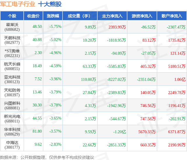 个股表现方面,军工电子行业当日领跌股为霍莱沃(688682),该股当日报收48.5,下跌5.75%,成交量9.89万,主力资金净流入2393.99万元。天箭科技(002977)以下跌5.02%紧随其后,该股当日成交量10.2万,主力资金净流出1818.95万元。除此之外,*ST奥维(002231)、航天长峰(600855)、亚光科技(300123)均进入当日熊股之列。具体个股列表见下表: