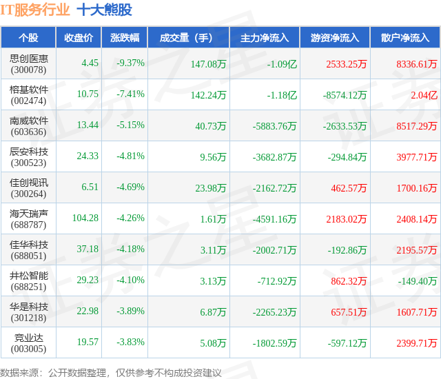 个股表现方面,IT服务行业当日领跌股为思创医惠(300078),该股当日报收4.45,下跌9.37%,成交量147.08万,主力资金净流出1.09亿元。榕基软件(002474)以下跌7.41%紧随其后,该股当日成交量142.24万,主力资金净流出1.18亿元。除此之外,南威软件(603636)、辰安科技(300523)、佳创视讯(300264)均进入当日熊股之列。具体个股列表见下表: