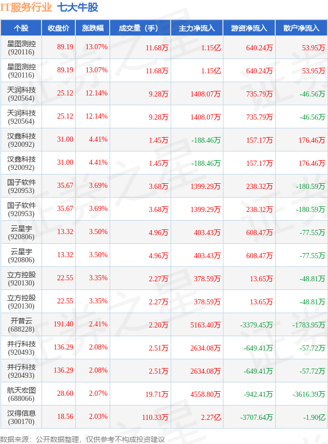 个股表现方面,IT服务行业当日领涨股为星图测控(920116),该股当日报收89.19,上涨13.07%,成交量11.68万,主力资金净流入1.15亿元。星图测控(920116)以上涨13.07%紧随其后,该股当日成交量11.68万,主力资金净流入1.15亿元。除此之外,天润科技(920564)、天润科技(920564)、汉鑫科技(920092)均进入当日牛股之列。具体个股列表见下表: