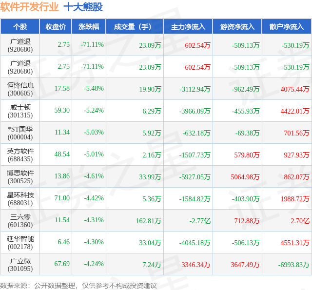 个股表现方面,软件开发行业当日领跌股为广道退(920680),该股当日报收2.75,下跌71.11%,成交量23.09万,主力资金净流入602.54万元。广道退(920680)以下跌71.11%紧随其后,该股当日成交量23.09万,主力资金净流入602.54万元。除此之外,恒锋信息(300605)、威士顿(301315)、*ST国华(000004)均进入当日熊股之列。具体个股列表见下表: