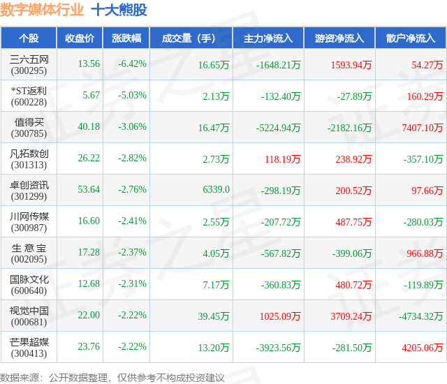 个股表现方面,数字媒体行业当日领跌股为三六五网(300295),该股当日报收13.56,下跌6.42%,成交量16.65万,主力资金净流出1648.21万元。*ST返利(600228)以下跌5.03%紧随其后,该股当日成交量2.13万,主力资金净流出132.4万元。除此之外,值得买(300785)、凡拓数创(301313)、卓创资讯(301299)均进入当日熊股之列。具体个股列表见下表:
