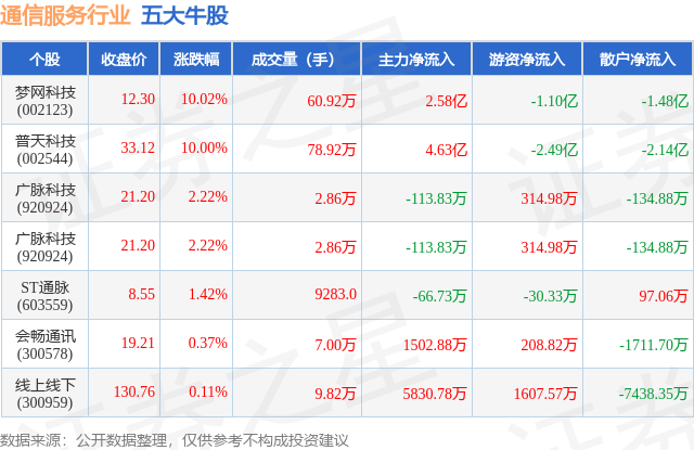 个股表现方面,通信服务行业当日领涨股为梦网科技(002123),该股当日报收12.3,上涨10.02%,成交量60.92万,主力资金净流入2.58亿元。普天科技(002544)以上涨10.0%紧随其后,该股当日成交量78.92万,主力资金净流入4.63亿元。除此之外,广脉科技(920924)、广脉科技(920924)、ST通脉(603559)均进入当日牛股之列。具体个股列表见下表: