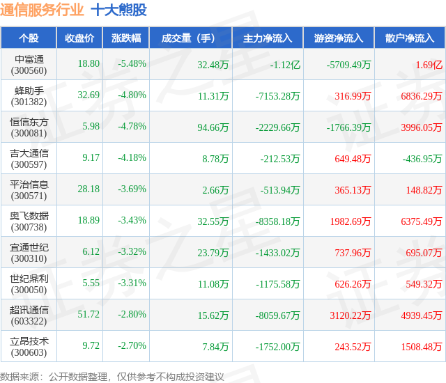 个股表现方面,通信服务行业当日领跌股为中富通(300560),该股当日报收18.8,下跌5.48%,成交量32.48万,主力资金净流出1.12亿元。蜂助手(301382)以下跌4.8%紧随其后,该股当日成交量11.31万,主力资金净流出7153.28万元。除此之外,恒信东方(300081)、吉大通信(300597)、平治信息(300571)均进入当日熊股之列。具体个股列表见下表: