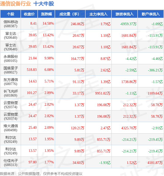 个股表现方面,通信设备行业当日领涨股为信科移动(688387),该股当日报收8.41,上涨14.58%,成交量246.06万,主力资金净流入1.79亿元。富士达(920640)以上涨13.42%紧随其后,该股当日成交量20.67万,主力资金净流入1.1亿元。除此之外,富士达(920640)、永鼎股份(600105)、国盾量子(688027)均进入当日牛股之列。具体个股列表见下表: