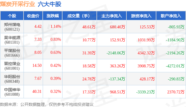 个股表现方面,煤炭开采行业当日领涨股为郑州煤电(600121),该股当日报收4.42,上涨1.14%,成交量48.61万,主力资金净流入680.4万元。昊华能源(601101)以上涨0.83%紧随其后,该股当日成交量10.77万,主力资金净流入152.91万元。除此之外,平煤股份(601666)、晋控煤业(601001)、华阳股份(600348)均进入当日牛股之列。具体个股列表见下表:
