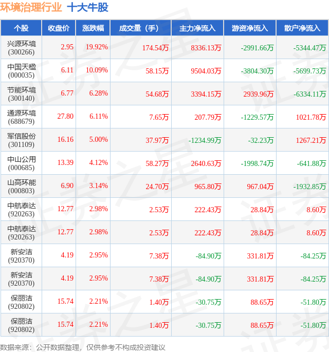 个股表现方面,环境治理行业当日领涨股为兴源环境(300266),该股当日报收2.95,上涨19.92%,成交量174.54万,主力资金净流入8336.13万元。中国天楹(000035)以上涨10.09%紧随其后,该股当日成交量58.15万,主力资金净流入9504.03万元。除此之外,节能环境(300140)、通源环境(688679)、军信股份(301109)均进入当日牛股之列。具体个股列表见下表: