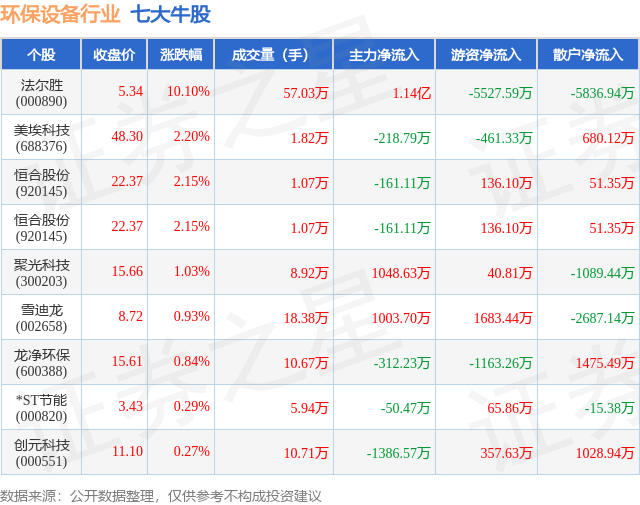 个股表现方面,环保设备行业当日领涨股为法尔胜(000890),该股当日报收5.34,上涨10.1%,成交量57.03万,主力资金净流入1.14亿元。美埃科技(688376)以上涨2.2%紧随其后,该股当日成交量1.82万,主力资金净流出218.79万元。除此之外,恒合股份(920145)、恒合股份(920145)、聚光科技(300203)均进入当日牛股之列。具体个股列表见下表: