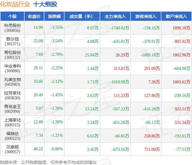 个股表现方面,化妆品行业当日领跌股为科思股份(300856),该股当日报收14.96,下跌3.55%,成交量8.97万,主力资金净流出1740.02万元。敷尔佳(301371)以下跌3.54%紧随其后,该股当日成交量4.08万,主力资金净流出435.01万元。除此之外,青松股份(300132)、华业香料(300886)、丸美生物(603983)均进入当日熊股之列。具体个股列表见下表: