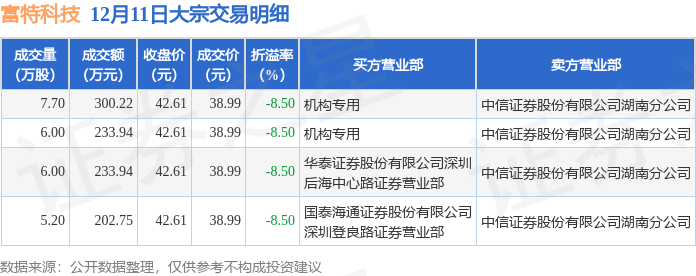 证券之星消息,12月11日富特科技发生大宗交易,交易数据如下: