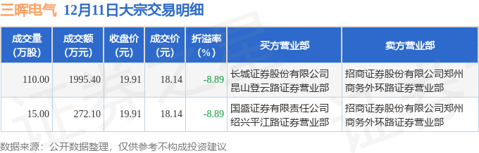 证券之星消息,12月11日三晖电气发生大宗交易,交易数据如下: