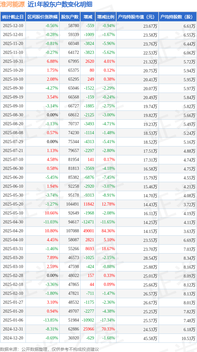 从股价来看,2025年12月1日至2025年12月10日,淮河能源区间跌幅为0.56%,在此期间股东户数减少559.0户,减幅为0.94%。