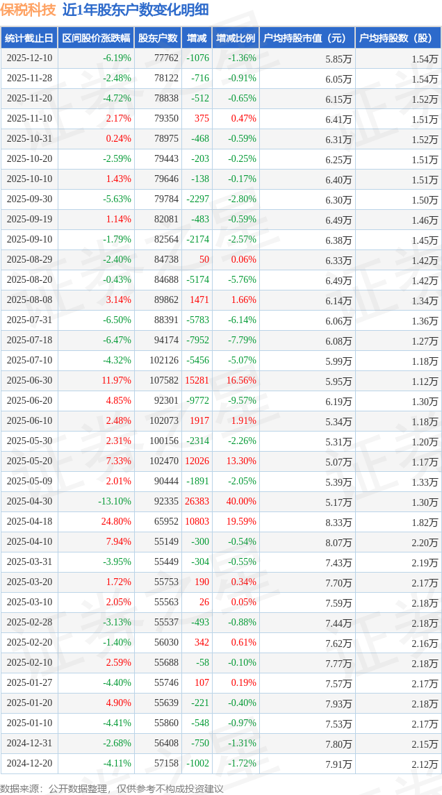 从股价来看,2025年11月20日至2025年12月10日,保税科技区间跌幅为6.19%,在此期间股东户数减少1076.0户,减幅为1.36%。