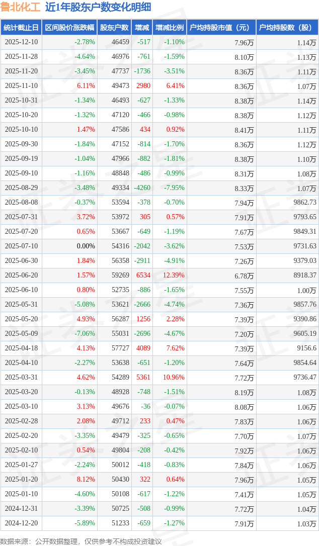 从股价来看,2025年11月28日至2025年12月10日,鲁北化工区间跌幅为2.78%,在此期间股东户数减少517.0户,减幅为1.1%。