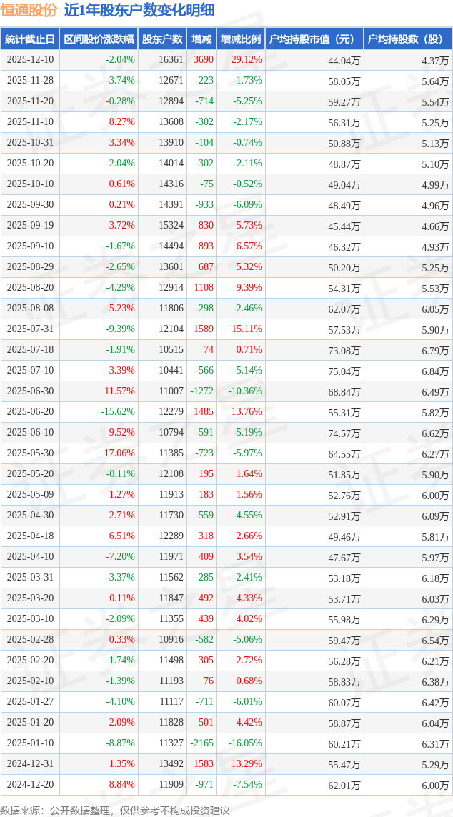 从股价来看,2025年11月28日至2025年12月10日,恒通股份区间跌幅为2.04%,在此期间股东户数增加3690.0户,增幅为29.12%。