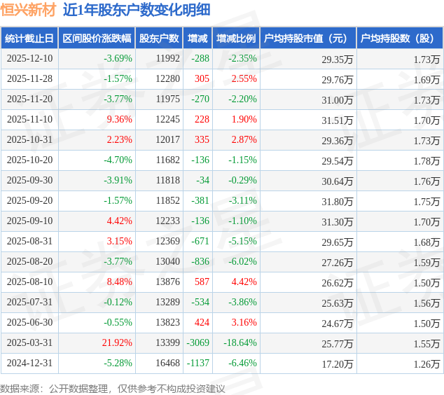 从股价来看,2025年11月30日至2025年12月10日,恒兴新材区间跌幅为3.69%,在此期间股东户数减少288.0户,减幅为2.35%。