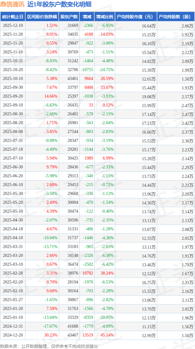 从股价来看,2025年11月30日至2025年12月10日,鼎信通讯区间涨幅为1.51%,在此期间股东户数减少2366.0户,减幅为6.95%。