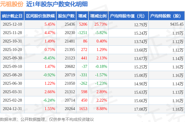 从股价来看,2025年11月28日至2025年12月10日,元祖股份区间涨幅为5.45%,在此期间股东户数增加5206.0户,增幅为25.73%。