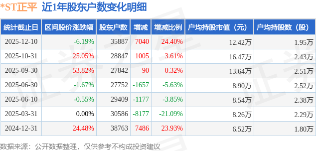从股价来看,2025年10月31日至2025年12月10日,*ST正平区间跌幅为6.19%,在此期间股东户数增加7040.0户,增幅为24.4%。