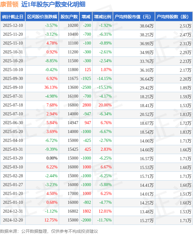 从股价来看,2025年11月28日至2025年12月10日,康普顿区间跌幅为3.57%,在此期间股东户数减少200.0户,减幅为1.92%。