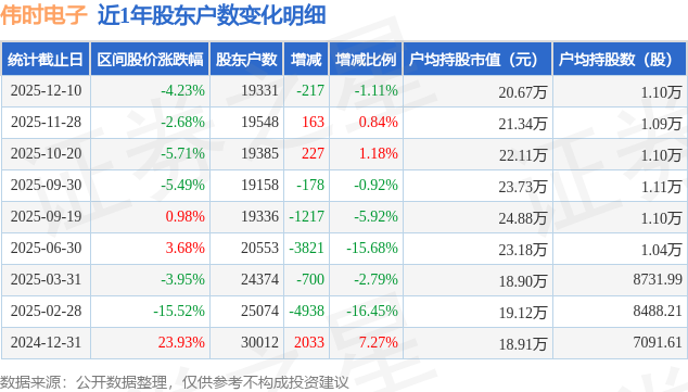 从股价来看,2025年11月28日至2025年12月10日,伟时电子区间跌幅为4.23%,在此期间股东户数减少217.0户,减幅为1.11%。
