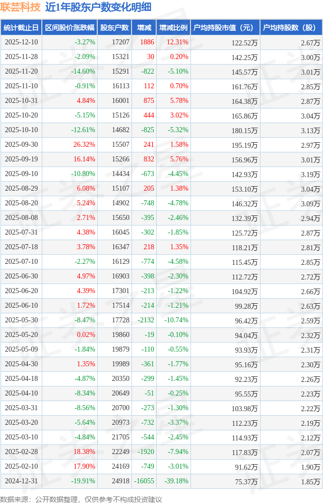 从股价来看,2025年11月28日至2025年12月10日,联芸科技区间跌幅为3.27%,在此期间股东户数增加1886.0户,增幅为12.31%。