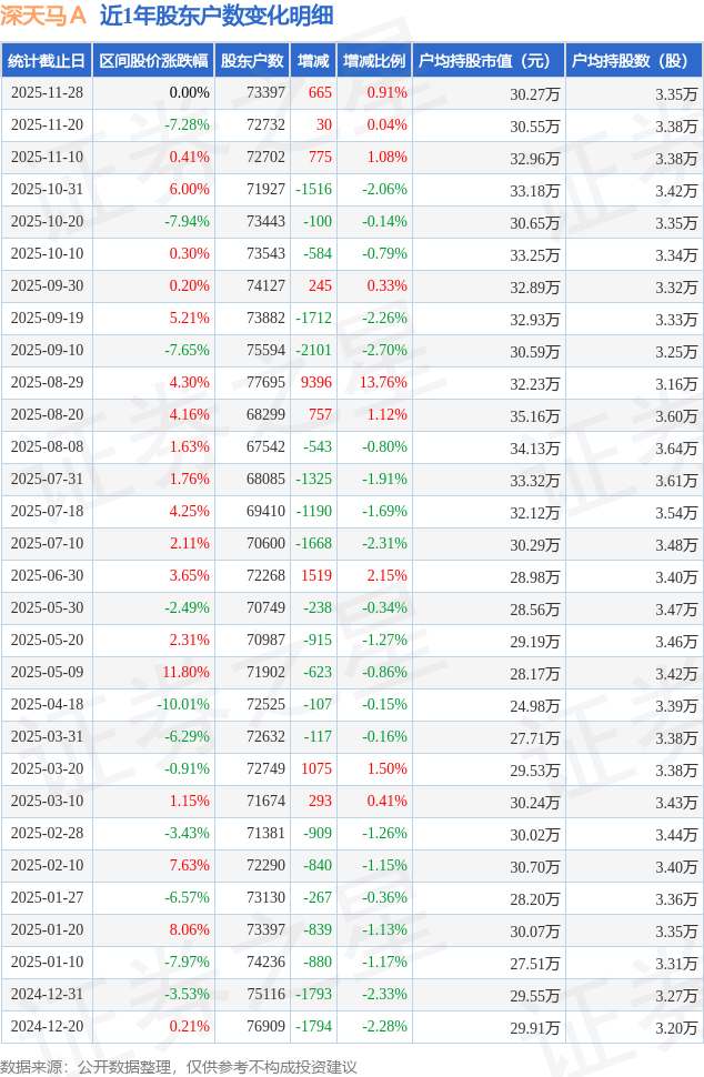 从股价来看,2025年11月20日至2025年11月28日,深天马A区间跌幅为0.0%,在此期间股东户数增加665.0户,增幅为0.91%。