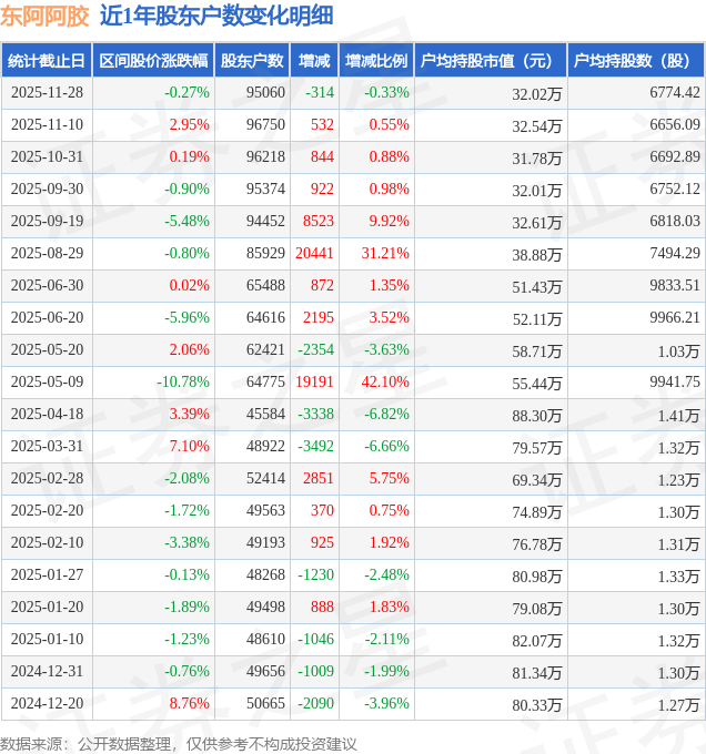 从股价来看,2025年9月30日至2025年11月28日,东阿阿胶区间跌幅为0.27%,在此期间股东户数减少314.0户,减幅为0.33%。