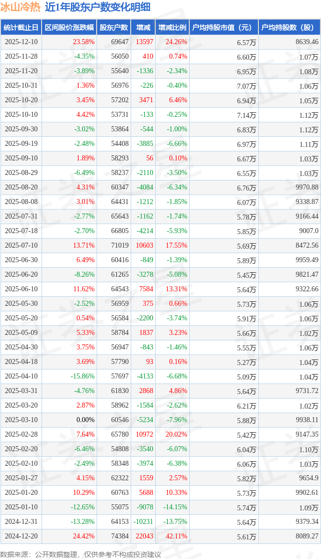 从股价来看,2025年11月28日至2025年12月10日,冰山冷热区间涨幅为23.58%,在此期间股东户数增加1.36万户,增幅为24.26%。