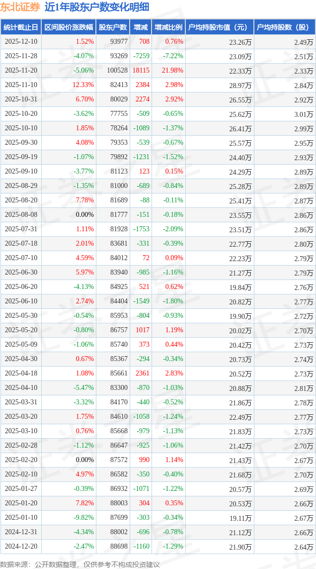 从股价来看,2025年11月28日至2025年12月10日,东北证券区间涨幅为1.52%,在此期间股东户数增加708.0户,增幅为0.76%。