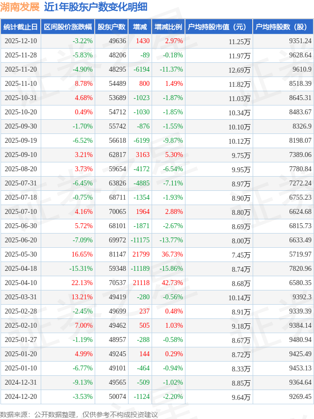 从股价来看,2025年11月28日至2025年12月10日,湖南发展区间跌幅为3.22%,在此期间股东户数增加1430.0户,增幅为2.97%。