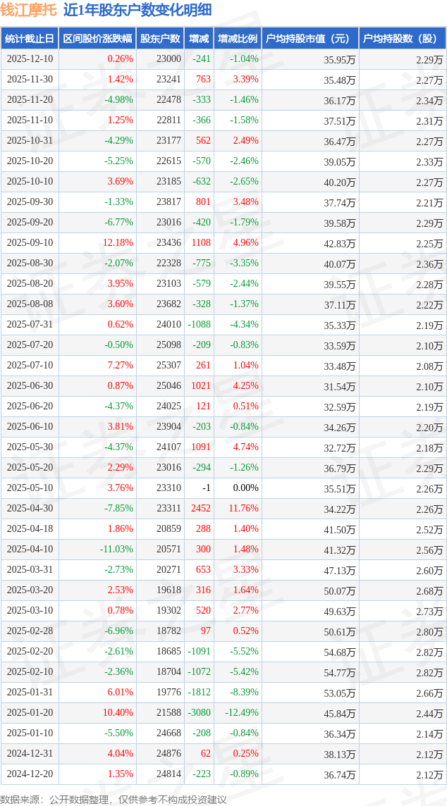 证券之星消息,近日钱江摩托披露,截至2025年12月10日公司股东户数为2.3万户,较11月30日减少241.0户,减幅为1.04%。户均持股数量由上期的2.27万股增加至2.29万股,户均持股市值为35.95万元。
