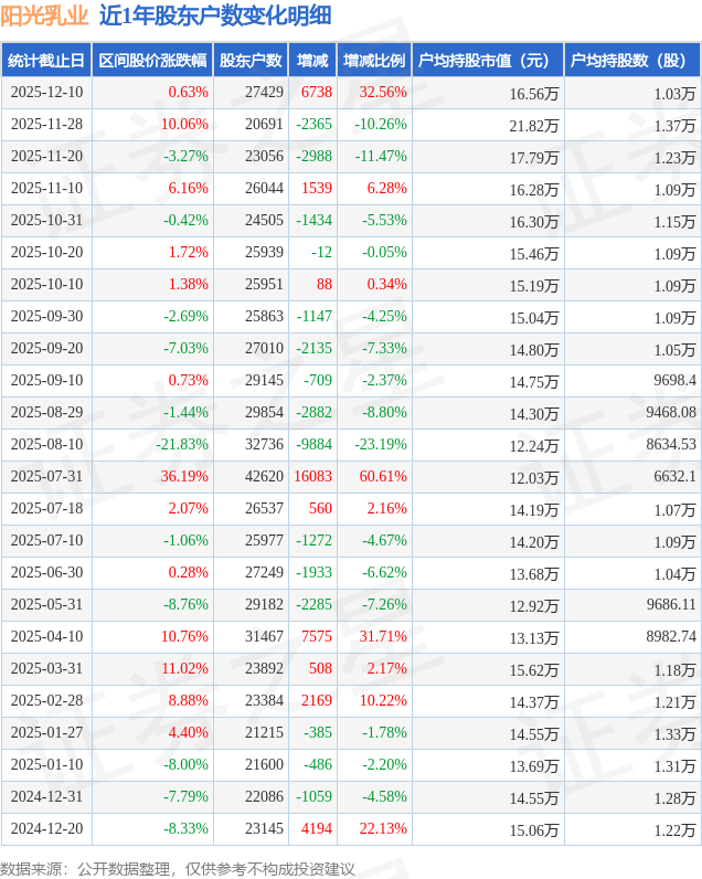 从股价来看,2025年11月28日至2025年12月10日,阳光乳业区间涨幅为0.63%,在此期间股东户数增加6738.0户,增幅为32.56%。