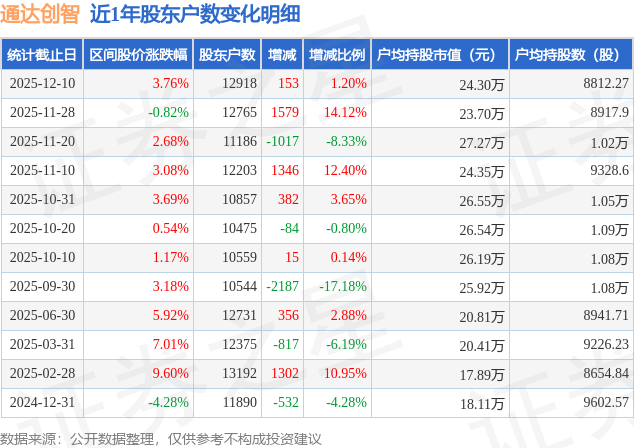 从股价来看,2025年11月28日至2025年12月10日,通达创智区间涨幅为3.76%,在此期间股东户数增加153.0户,增幅为1.2%。