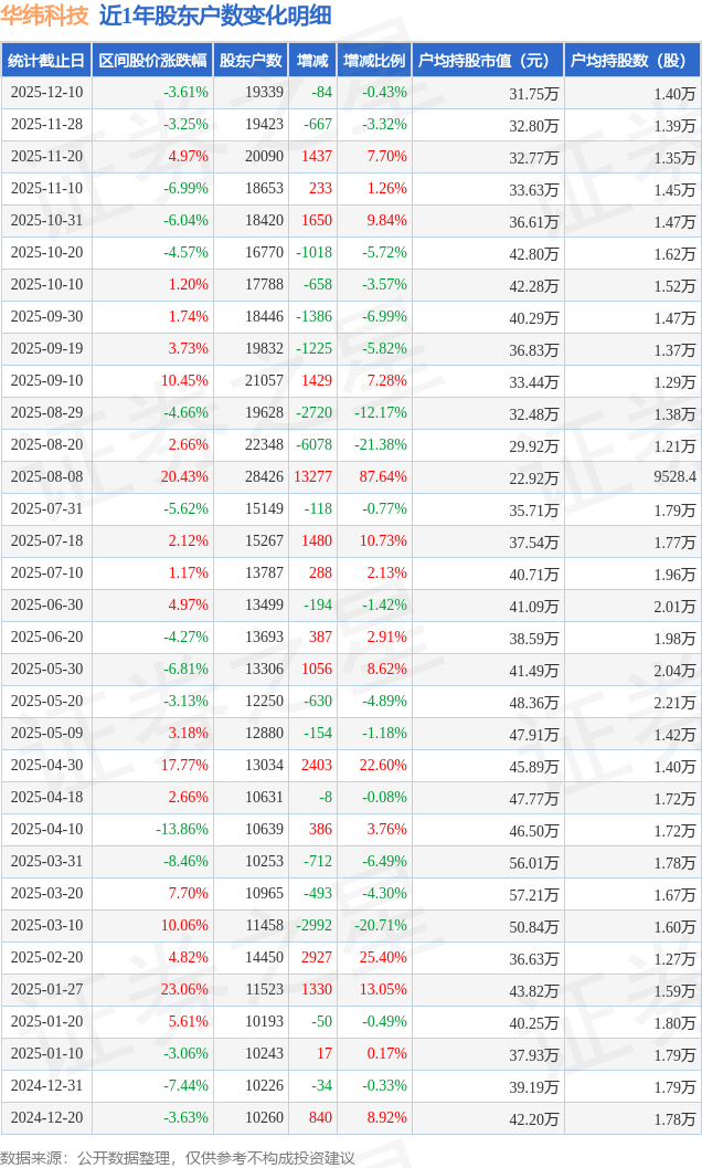 从股价来看,2025年11月28日至2025年12月10日,华纬科技区间跌幅为3.61%,在此期间股东户数减少84.0户,减幅为0.43%。