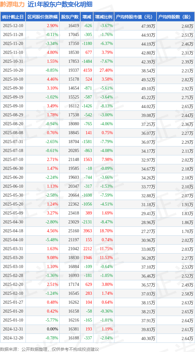 从股价来看,2025年11月28日至2025年12月10日,黔源电力区间涨幅为2.9%,在此期间股东户数减少626.0户,减幅为3.67%。