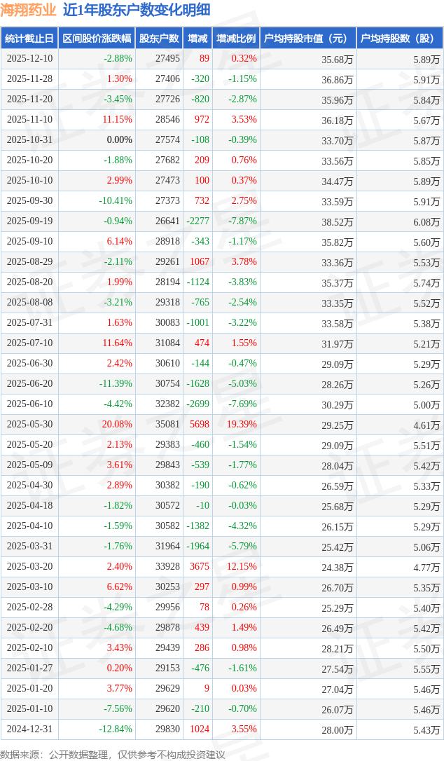 从股价来看,2025年11月28日至2025年12月10日,海翔药业区间跌幅为2.88%,在此期间股东户数增加89.0户,增幅为0.32%。