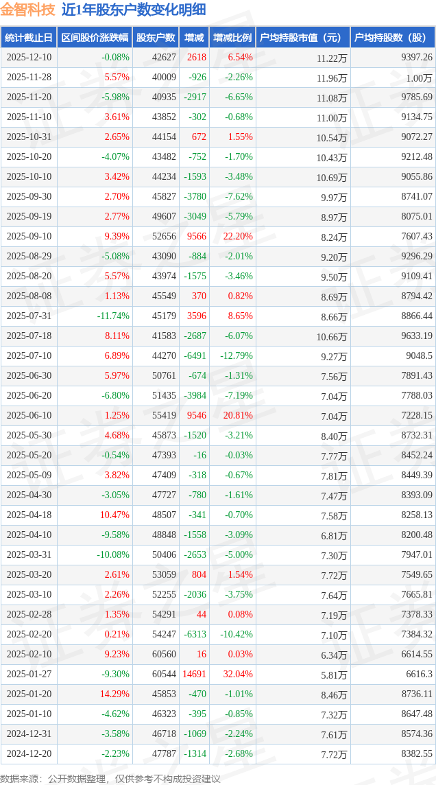 从股价来看,2025年11月28日至2025年12月10日,金智科技区间跌幅为0.08%,在此期间股东户数增加2618.0户,增幅为6.54%。
