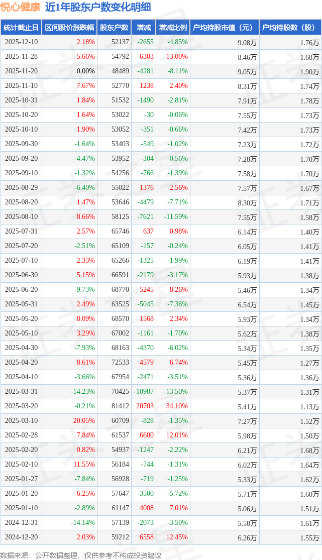 从股价来看,2025年11月30日至2025年12月10日,悦心健康区间涨幅为2.18%,在此期间股东户数减少2655.0户,减幅为4.85%。