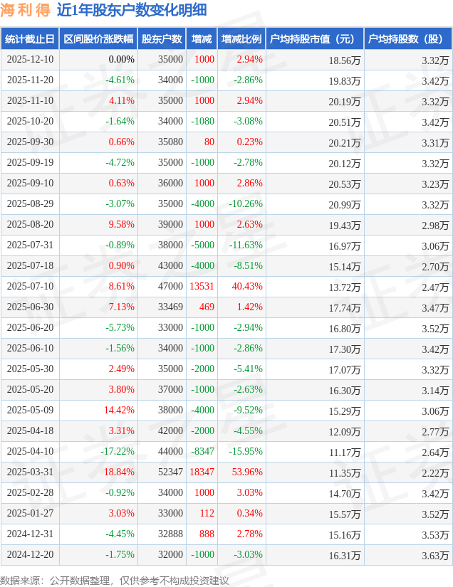 证券之星消息,近日海 利 得披露,截至2025年12月10日公司股东户数为3.5万户,较11月30日增加1000.0户,增幅为2.94%。户均持股数量由上期的3.42万股减少至3.32万股,户均持股市值为18.56万元。